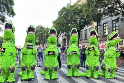 Xóchitl Gálvez reaparece en Palacio Nacional: Envía botargas de dinosaurios con mensajes de #FuerzaMinistros