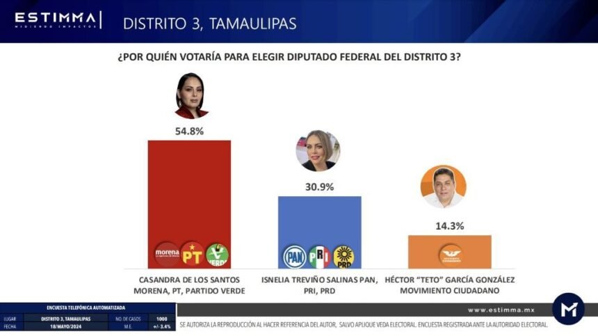 Casandra de los Santos de MORENA-PT-PV lidera preferencia electoral en el Distrito 3 de Tamaulipas, revela sondeo de ESTIMMA