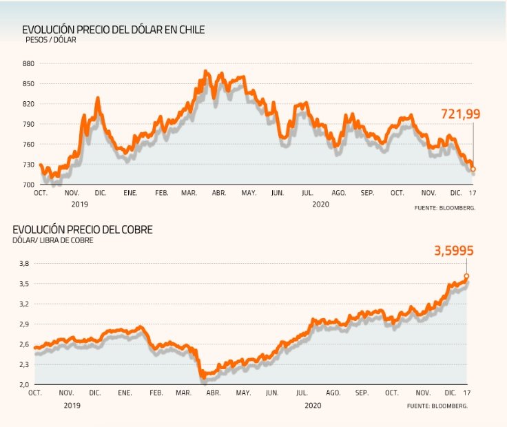 Para Ogaz otros factores que inciden en la baja del precio del dólar “a nivel internacional, se encuentra el precio del cobre -que esta jornada se ubica sobre los US$ 3,55 la libra- precio que es altamente probable se mantenga en dichos niveles ante la sólida recuperación de China”. Además menciona que otro elemento es “la caída de la aversión al riesgo por el comienzo del proceso de vacunación en varios países y el debilitamiento del dólar a nivel multilateral (DXY) lo que ha apoyado la apreciación de monedas emergentes”.