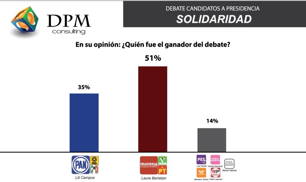 Tras el debate de candidatos por al alcaldía de Solidaridad, la favorita y ganadora fue la abanderada de Morena, Laura Beristain, según el sondeo realizado por DPM Consulting.