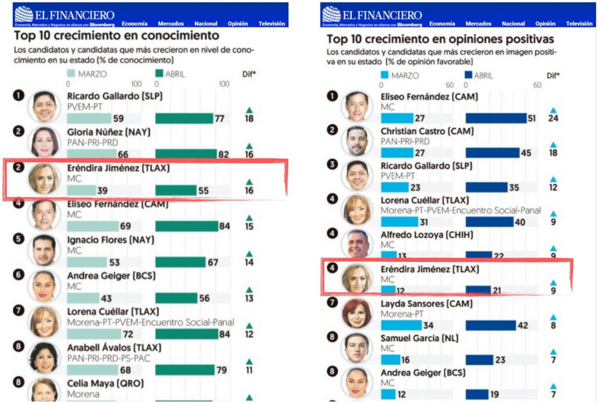 Y parece que todo el trabajo realizado va cobrando su ganancia, ya que en una encuesta publicada el día de ayer por el Financiero muestra a la candidata como una de las diez aspirantes a nivel nacional con mayor crecimiento en cuanto a conocimiento y aprobación por parte de la población, respecto al mes de marzo.