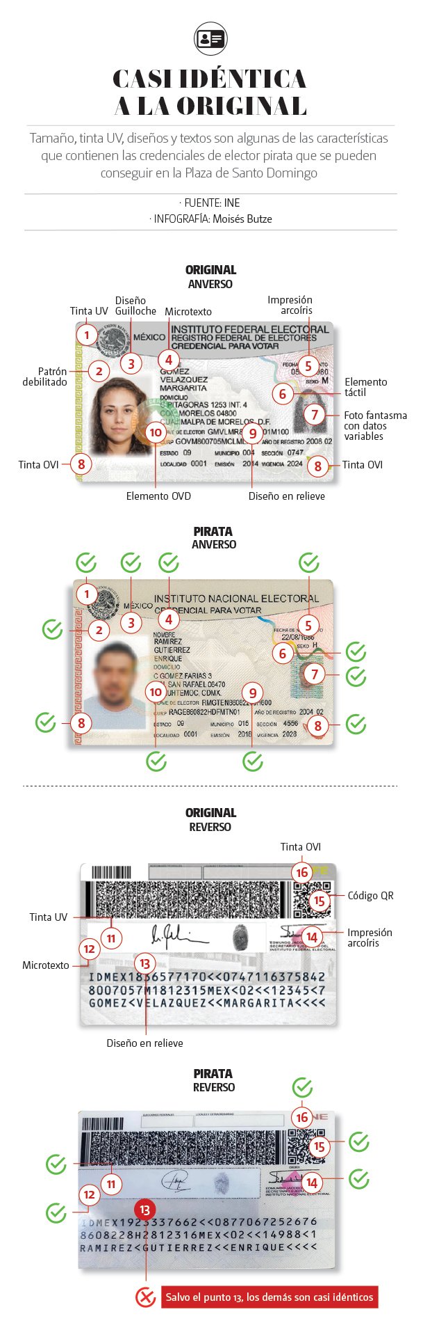 La credencial para votar cuenta con 16 elementos de seguridad, 15 de los cuales están presentes en la versión apócrifa.