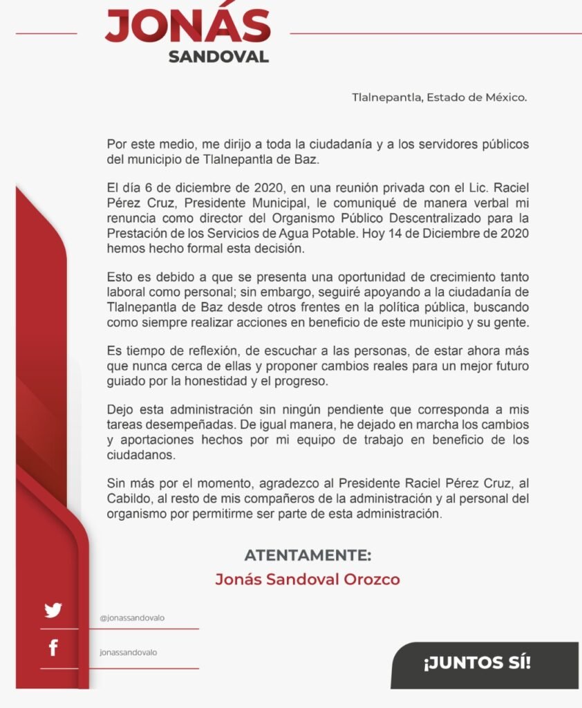 El titular del Organismo Público Descentralizado para la Prestación de los Servicios de Agua Potable, Alcantarillado y Saneamiento del Municipio de Tlalnepantlael Lic. Jonás Sandoval Orozco, presentó su renuncia formal ante el alcalde el Lic. Raciel Pérez Cruz.