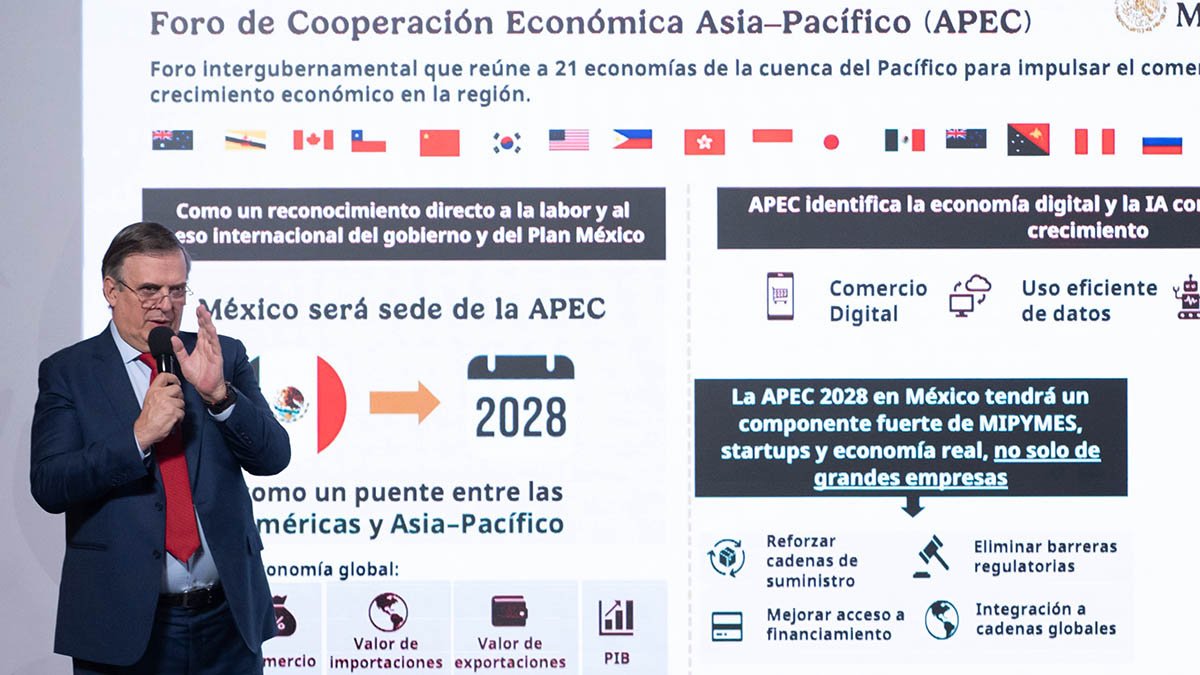 En 2028, México será sede del Foro de Cooperación Económica Asia-Pacífico (APEC), donde participarán China, Estados Unidos, Canadá, Corea del Sur, Japón, Australia y Perú, entre otros. Ebrard destacó que la región del Pacífico concentra 61 por ciento del PIB global, y señaló que la sede mexicana permitirá fortalecer la presencia del país como puente entre América y Asia.