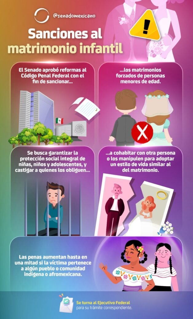 El Senado de la República aprobó este miércoles un proyecto para penalizar el matrimonio forzado de menores (matrimonio infantil), delito que tendrá una pena de hasta 18 años de cárcel y multa, que podría aumentar si la víctima es integrante de una comunidad indígena o comunidad afromexicana.