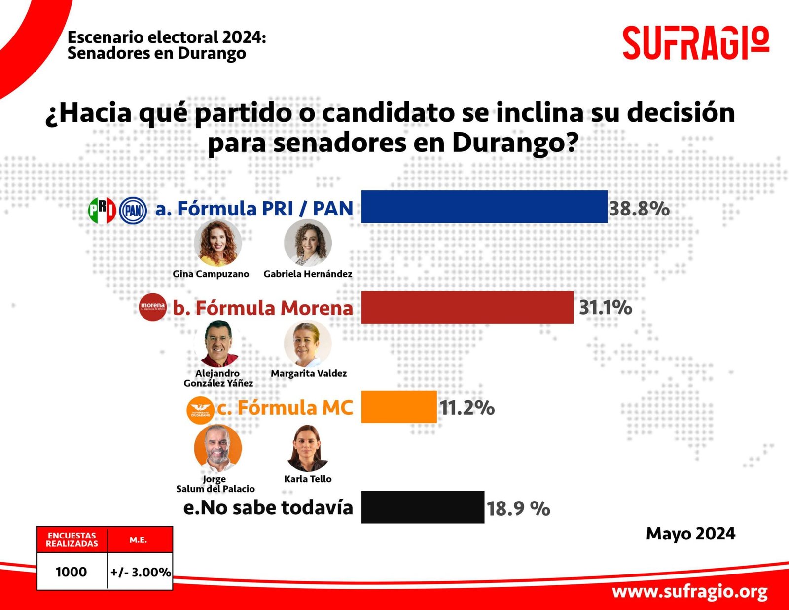 Según una reciente encuesta publicada por Sufragio, la fórmula conformada por el PRI y el PAN, representada por Gabriela Hernández y Gina Campuzano como candidatas al Senado, lidera las preferencias del electorado en Durango con un 38.8%. Esta alianza supera a la fórmula de Morena, que obtiene un 31.1% de las preferencias, y a la fórmula de Movimiento Ciudadano, que alcanza un 11.2%.